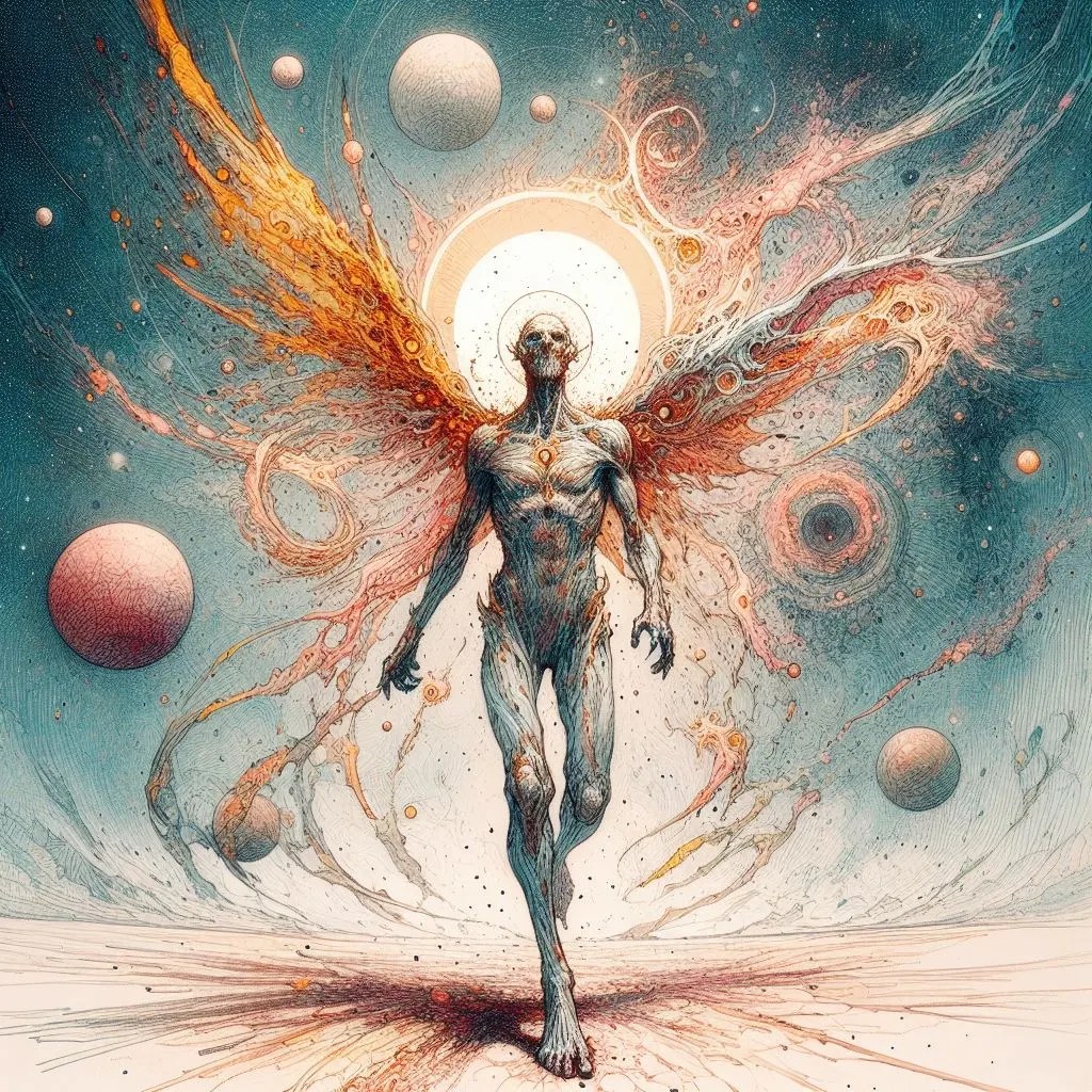 Wearily, Jacob slowly peers out from beneath his trembling fingers and gasps with horror, the breath catching in his chest. Before him stands the figure, towering above him with wings of flesh and flame, surrounded by endless stars and planets.