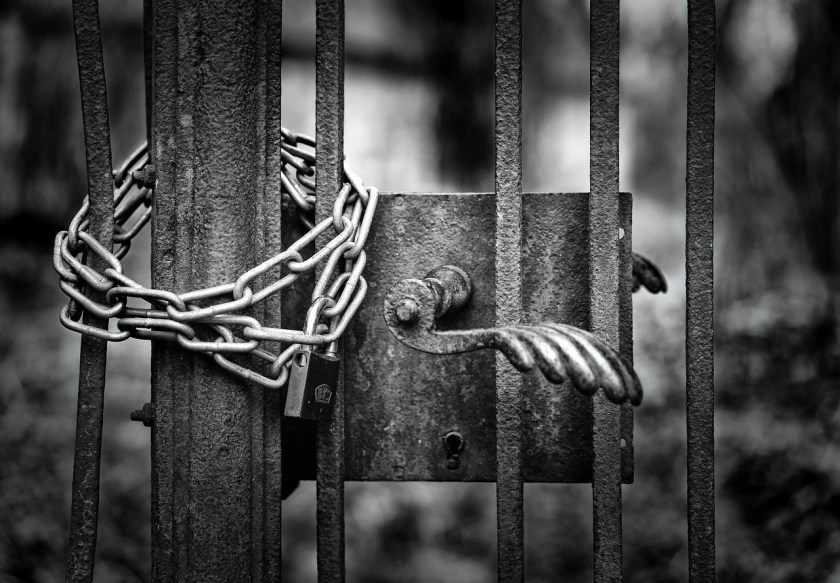 Harry slams the gate shut behind them, pulls the heavy chain from his knapsack, and frantically winds it around the gate and fence. With a strained grunt, he thrusts a boot against the gate, pulls the chain taut, and looks over to Gwen with a panicked glance.