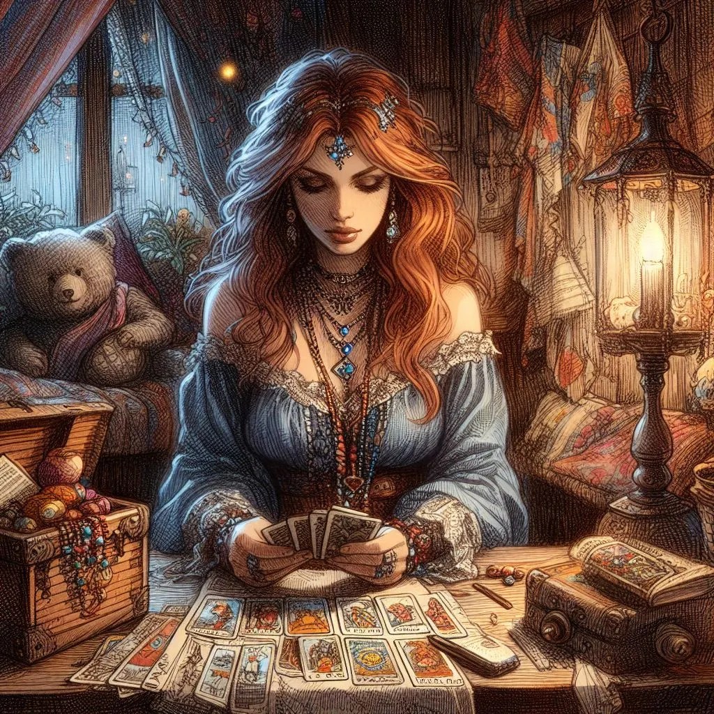“As I was saying, let me continue the reading, and as the cards fall, so will the path you seek,” she says as she places the next card down—”the Tower.”