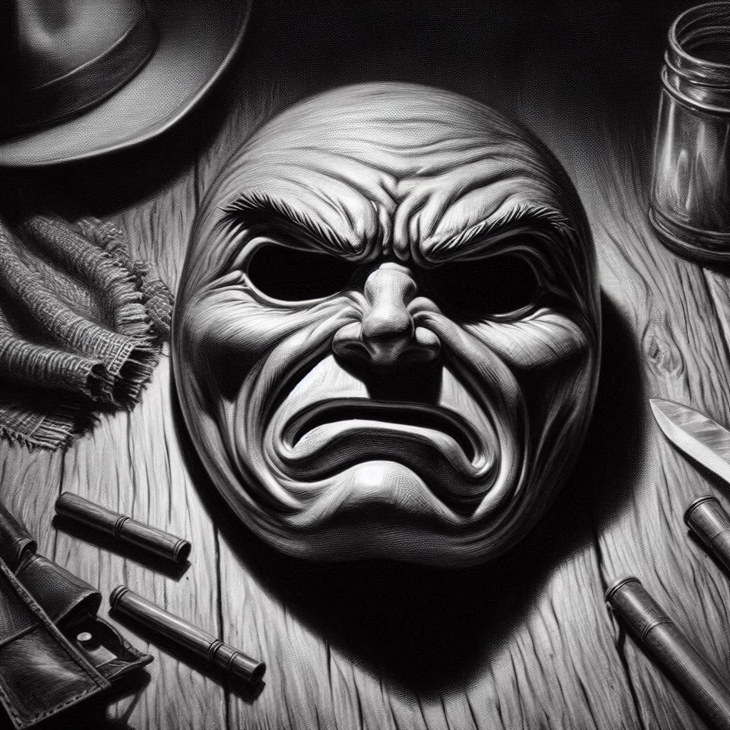 His nose screws up as he pulls a pistol from his jacket, pressing the muzzle against the mask’s bloody forehead. He laughs—a jagged, wild sound that cracks the air.
